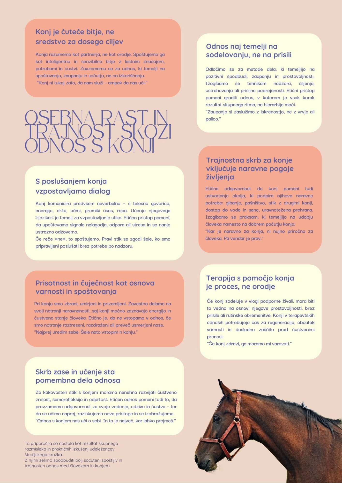Naše izkušnje in razmisleke smo ob zaključku združili v plakat s priporočili, ki povzema bistvo našega skupnega procesa in nas spodbuja k etičnemu, sočutnemu odnosu s konji.
